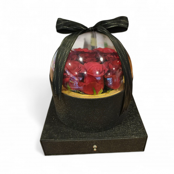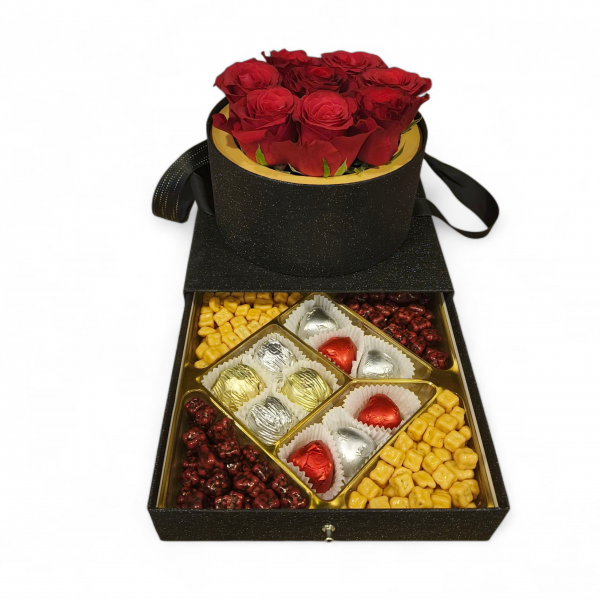 Fanus kapaklı kutuda kırmızı gğller ve çikolatalar