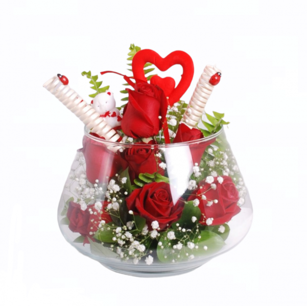 Fanus içerisinde 7 kırmızı gül strafor ayıcık, cubuk kalp ve çeşitli aksesuarlarnile hazırlanmış cam vazo aranjmanımız ile sevdikleriniz mutlu etmek istemez misiniz?
