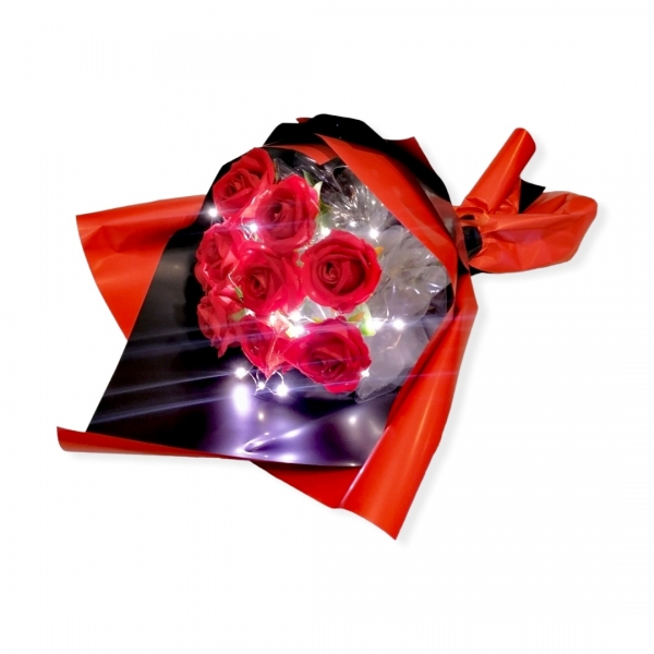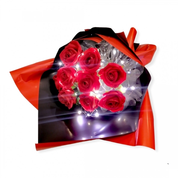 Gerçeğinden ayırt edemeyeceğiniz 1. Kalite 9 kırmızı yapay gül ile hazırlanan ışılklı buketimiz