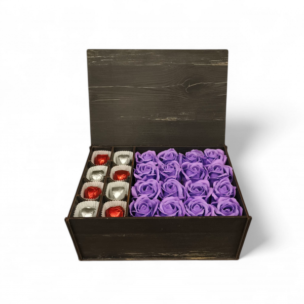 Hediyelik kutuda kalp çikolatalar ve kokulu lila yapay güller ile sevginizi anlatmanın en lezzetli yolu...