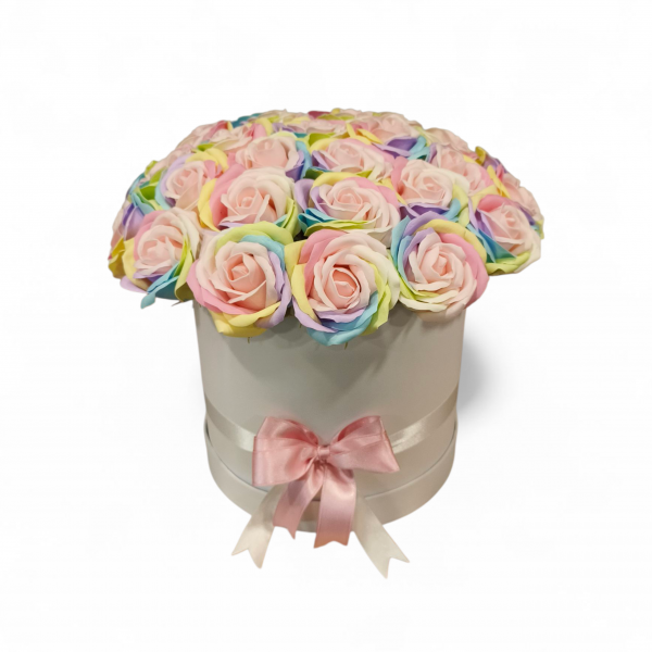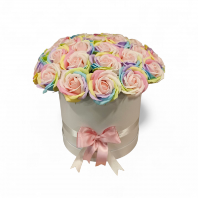 Beyaz kutuda 32 yapay rainbow gül aranjmanı