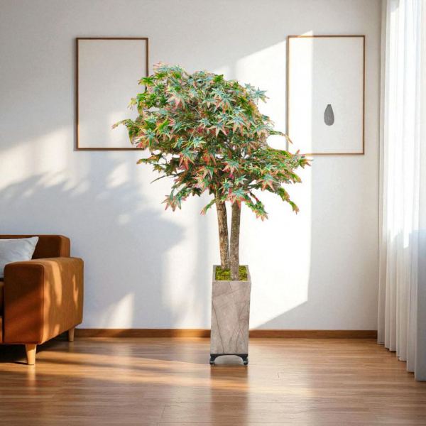 Mermer görünümlü mdflam saksı içerisinde gerçek ağaç gövdesine işlenmiş 180 cm. boyunda. 2 gövdeli.