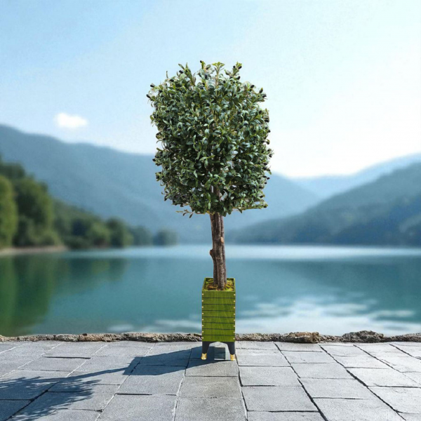 Ahşap saksı içerisinde gerçek ağaç gövdesine işlenmiş 200 cm. boyunda. 3 gövdeli. Siyah zeytin taneli.